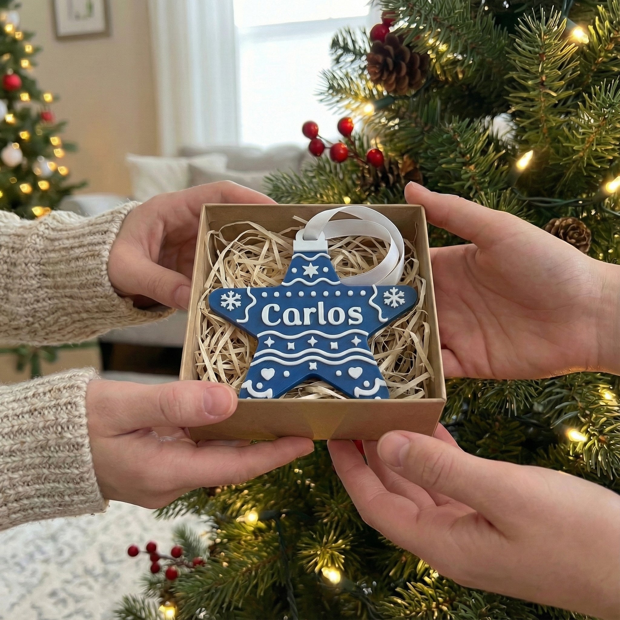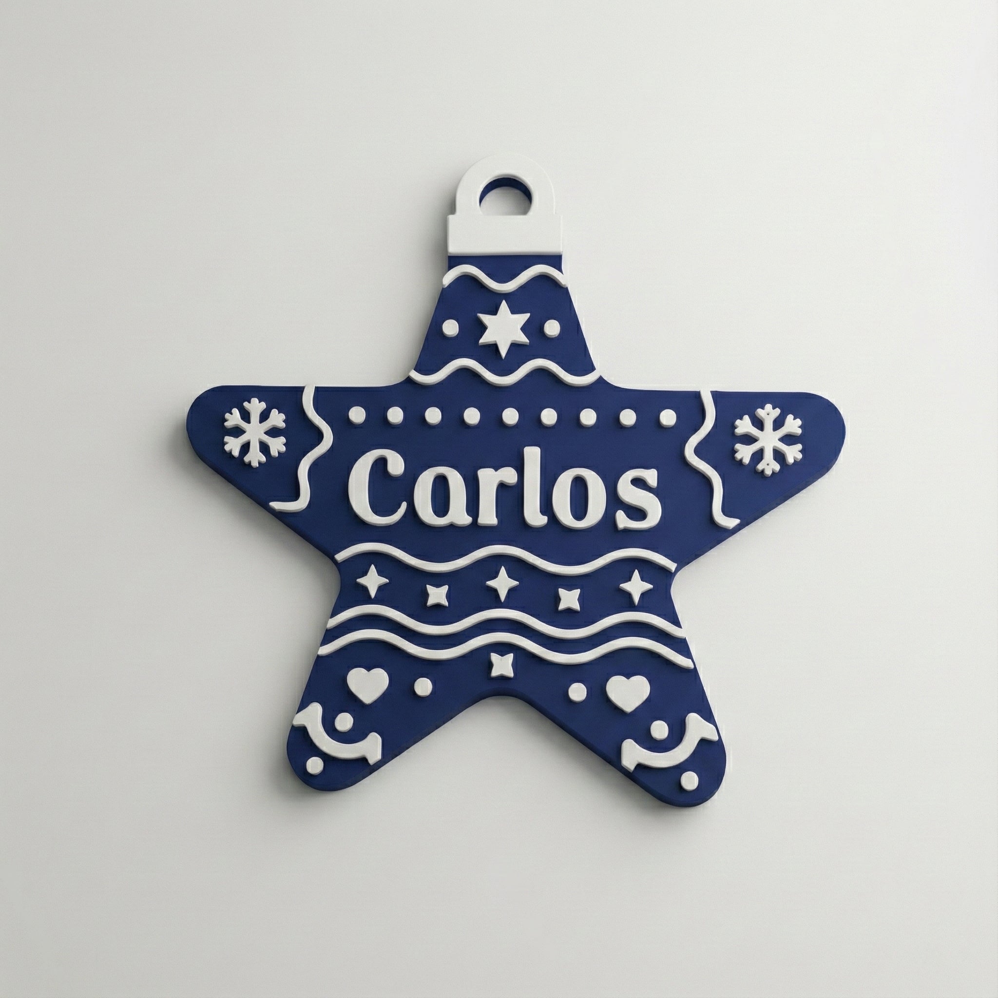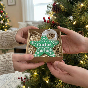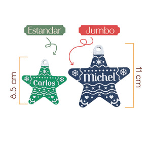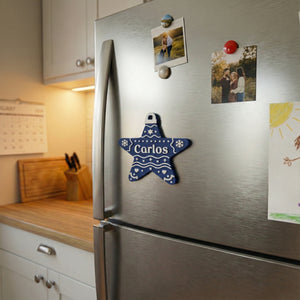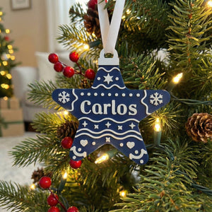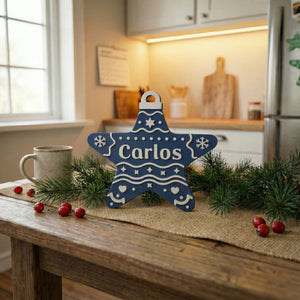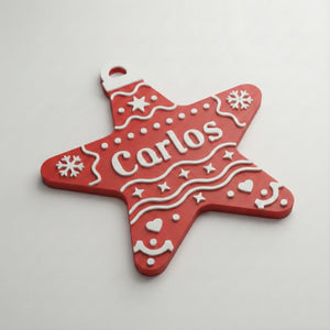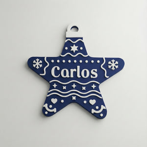 Estrella navideña personalizada (Nombre), hecha en PLA. Incluye un imán trasero para colocarla en superficies metálicas y está diseñada para decorar tu pino con los nombres de cada integrante de la familia. Ideal para crear una Navidad más cálida, única y especial.